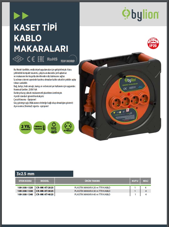 PLASTİK KASET MAKARA 30 m 3*2,5 MM2 TTR KABLO CR-MK-KT-3025